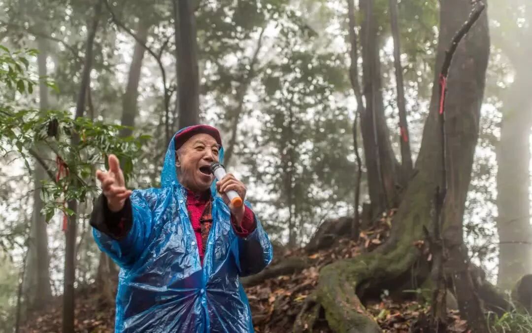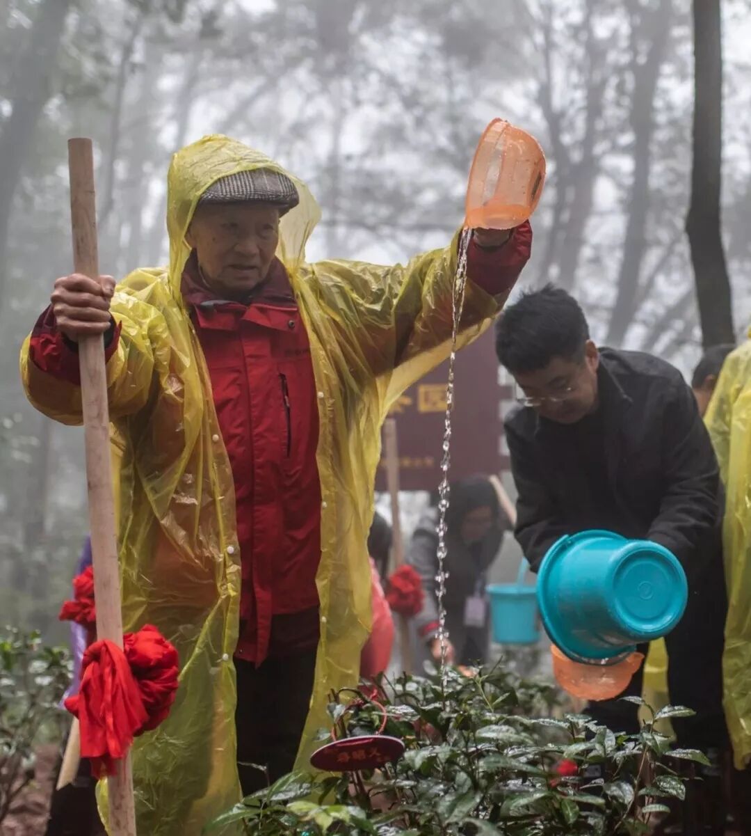 授牌儀式后,2018年蒙頂山植茶節(jié)正式在陰陽石麒麟牌坊邊的茶園拉開序幕。著名茶文化專家、四川省茶藝術(shù)研究會顧問、80多歲高齡的蔣昭義老先生,在植樹現(xiàn)場頌讀《蒙山植茶賦》,禮贊茶祖吳理真。同樣是80多歲高齡的碧潭飄雪創(chuàng)始人、四川省茶藝術(shù)研究會名譽會長徐金華也現(xiàn)場賦詩,“我是一棵樹,我是一棵老茶樹……”為古老的蒙頂山茶代言,自喻老茶樹深,扎根于茶山,老驥伏櫪的豪情贏得滿場喝彩。嘉賓們腳穿雨靴,肩扛鐵鏟,親手種下茶樹,培好泥土,澆上甘露井的泉水,掛上自己的名牌。天公作美,降下甘霖,蒙頂山土質(zhì)松軟,腐植豐富,遇雨特別濕滑?,F(xiàn)場嘉賓都是資深茶人,當然認識這才是最適合茶樹生長的上等土質(zhì)。雖然一腳泥濘,卻個個興致勃勃,冒著冬雨,一邊種茶一邊唱起了山歌。