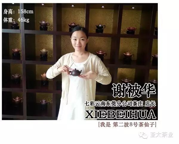 謝被華說(shuō):湖南妹紙一枚,2012年12月份進(jìn)入七彩云南茶業(yè)東莞分公司,便對(duì)茶葉萌發(fā)了濃厚的興趣,對(duì)普洱茶更是情有獨(dú)鐘,普洱的魅力深深的地引著我;因?yàn)?,?duì)茶不斷地深入了解,中國(guó)茶文化源遠(yuǎn)流長(zhǎng)的歷史傳承與普洱茶收藏、品鑒的價(jià)值,讓我更加堅(jiān)定了茶行業(yè)這一條道路。通過(guò)這次活動(dòng),讓我認(rèn)識(shí)到身邊的人對(duì)我的認(rèn)可,很開心!