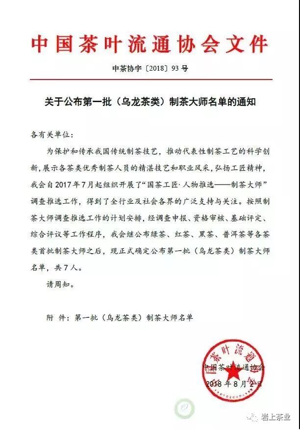 中國茶葉流通協(xié)會組織專家進行認真研究,按申報人從業(yè)年齡、文化程度、技能職稱、獲得榮譽、制茶技術(shù)、傳承創(chuàng)新、行業(yè)貢獻和綜合影響力等多個方面進行綜合評價,在第一批候選人中確定了首批7名(烏龍茶類)中國制茶大師,其中劉國英先生入選。