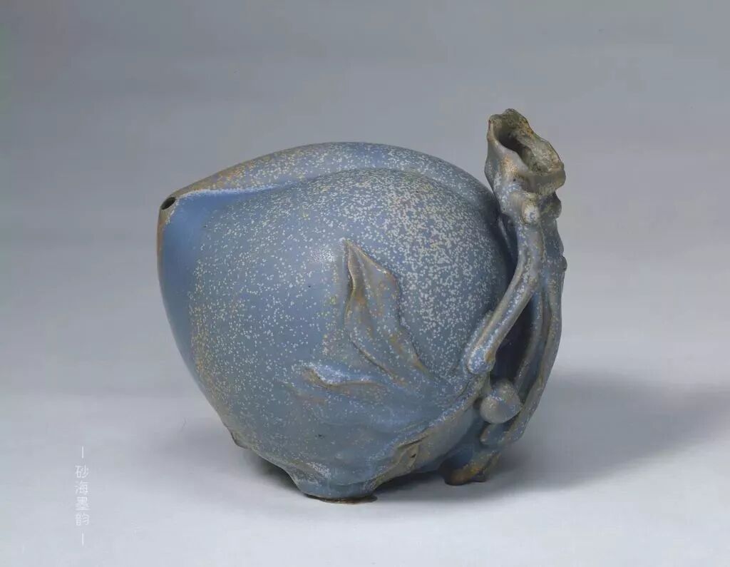 在故宮博物院和臺(tái)北故宮博物院中分別藏有一件紫砂胎宜均釉蟠桃水注,兩者形式極其相似,應(yīng)是同一時(shí)期所作。