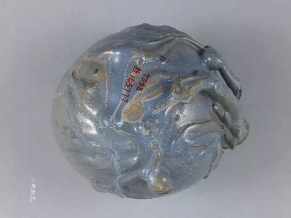 高9.5cm 長4.5cm?海螺式,有三支釘為足。紫砂內(nèi)胎,薄而輕。里外滿釉,釉色灰中泛藍(lán)綠,厚而不膩,濃艷光亮。