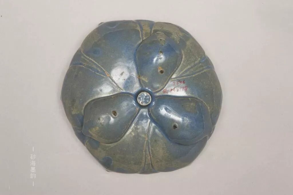 高7.1cm,口徑19.3cm,足距10cm洗呈盛開的蓮花狀,底下承以三個(gè)乳凸小足。通體施天藍(lán)色釉,釉層乳濁不透明。?明代宜鈞陶器的釉色較豐富。此蓮花洗為純正的天藍(lán)色。