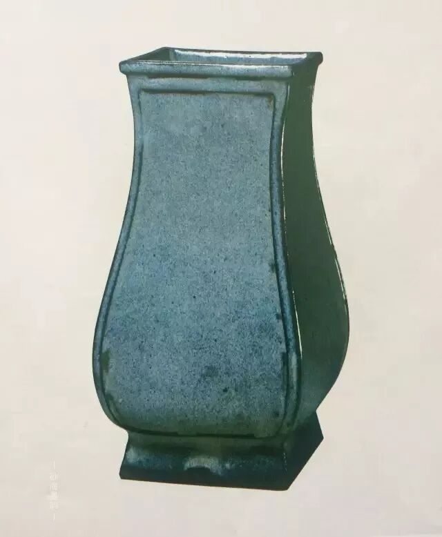 方口,垂腹,方圈足。形制由古代青銅器漢方壺演變而來。?深紫色砂泥,胎略厚,里外施乳濁的灰藍(lán)色釉,里釉只施及里口下兩寸處,外施釉至圈足處。是常見的宮廷陳設(shè)瓷。