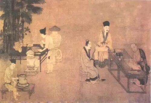中國人飲茶是從鮮葉生吃咀嚼開始,后變?yōu)樯~煮飲,形成比較原始的煮茶方法。唐宋時代通行煮茶,方法是先把茶葉碾成碎末,制成茶團,飲用時把茶搗碎,加入蔥、姜、桔子皮、薄荷、棗和鹽等調(diào)料一起煎煮。還有把茶葉碾成碎末,羅細,然后沖水將茶末調(diào)成糊狀喝下,因而叫做“吃茶”。