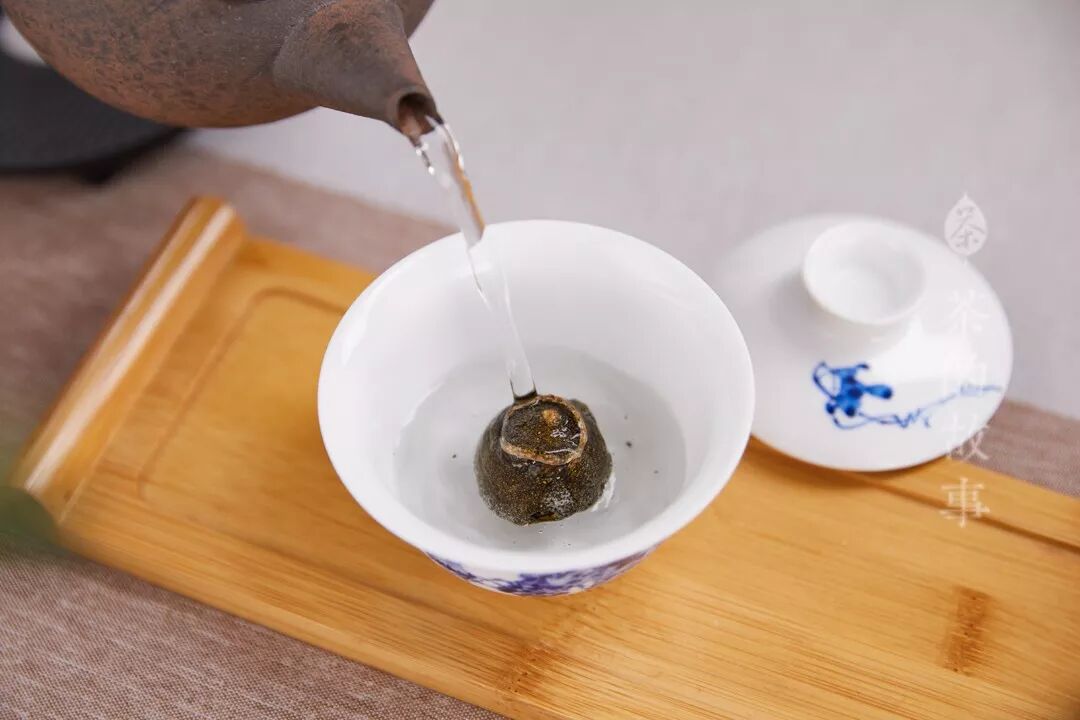 更快出味的小技巧二。注水可以對著青柑上的開孔,水從青柑內(nèi)部流淌而過,茶味更快浸出,茶湯喝著更濃郁。