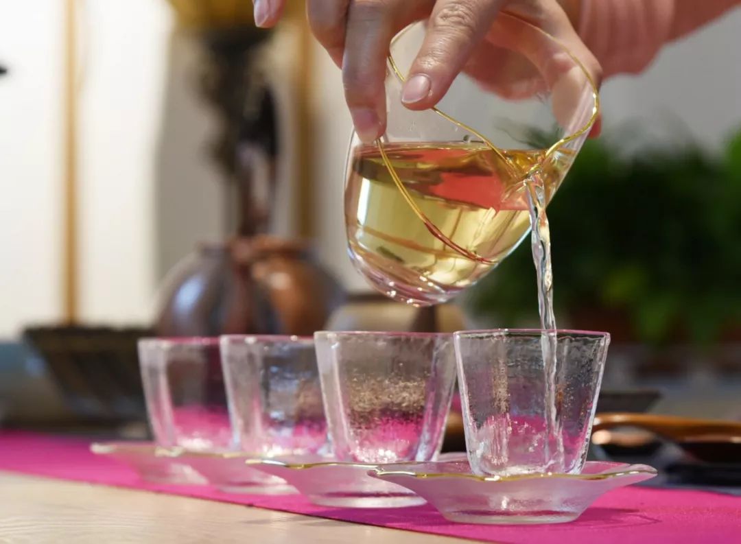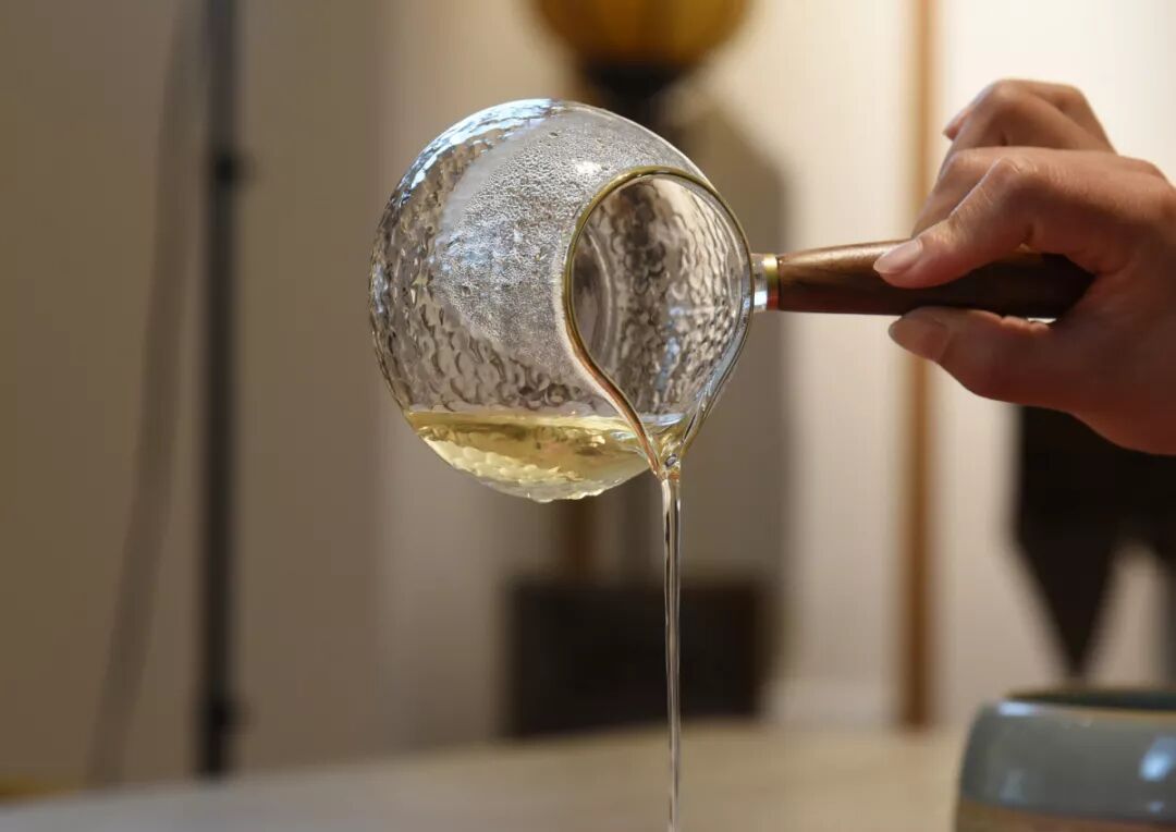 用玻璃茶器盛茶,輕輕晃動(dòng)茶湯,便可觀察茶湯的厚薄。厚一些的茶湯抱團(tuán)集中往一個(gè)方向較小幅度的晃動(dòng),而薄一些的茶湯則容易渙散開且動(dòng)靜相對(duì)較大的搖擺。
